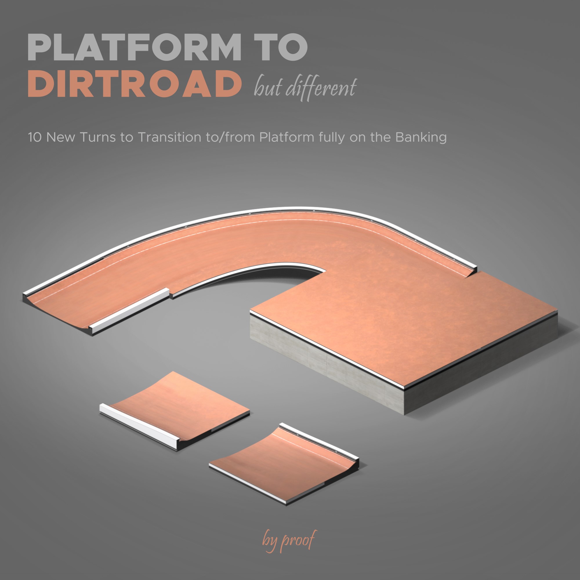 Small set with a series of 8 Flat2Flat 1up and 2up turns that allow you to go from DirtRoad to Platform and vice versa but on proper Dirtbanking.